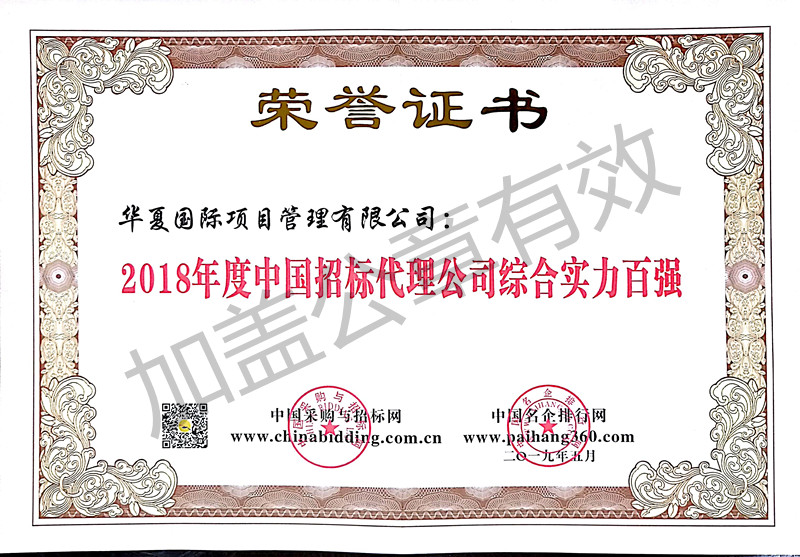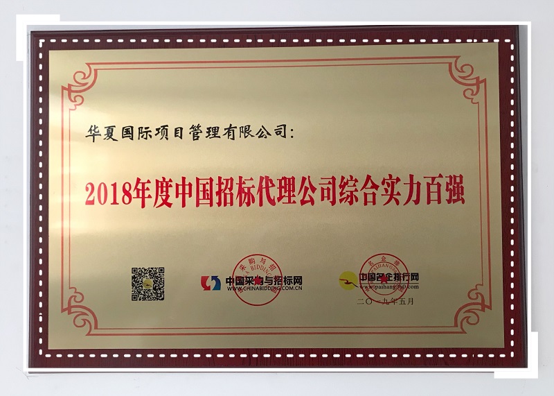 2019年5月,華夏國際項目管理有限公司在全國招投標領域年度聚焦評價推介活動中榮獲“2018年度中國招標代理公司綜合實力百強”。全國招投標領域年度聚焦評價推介活動由中國采購與招標網、中國名企排行網于2007年發起,至今已連續舉辦13屆,已成為全國招投標領域的典范與風向標。